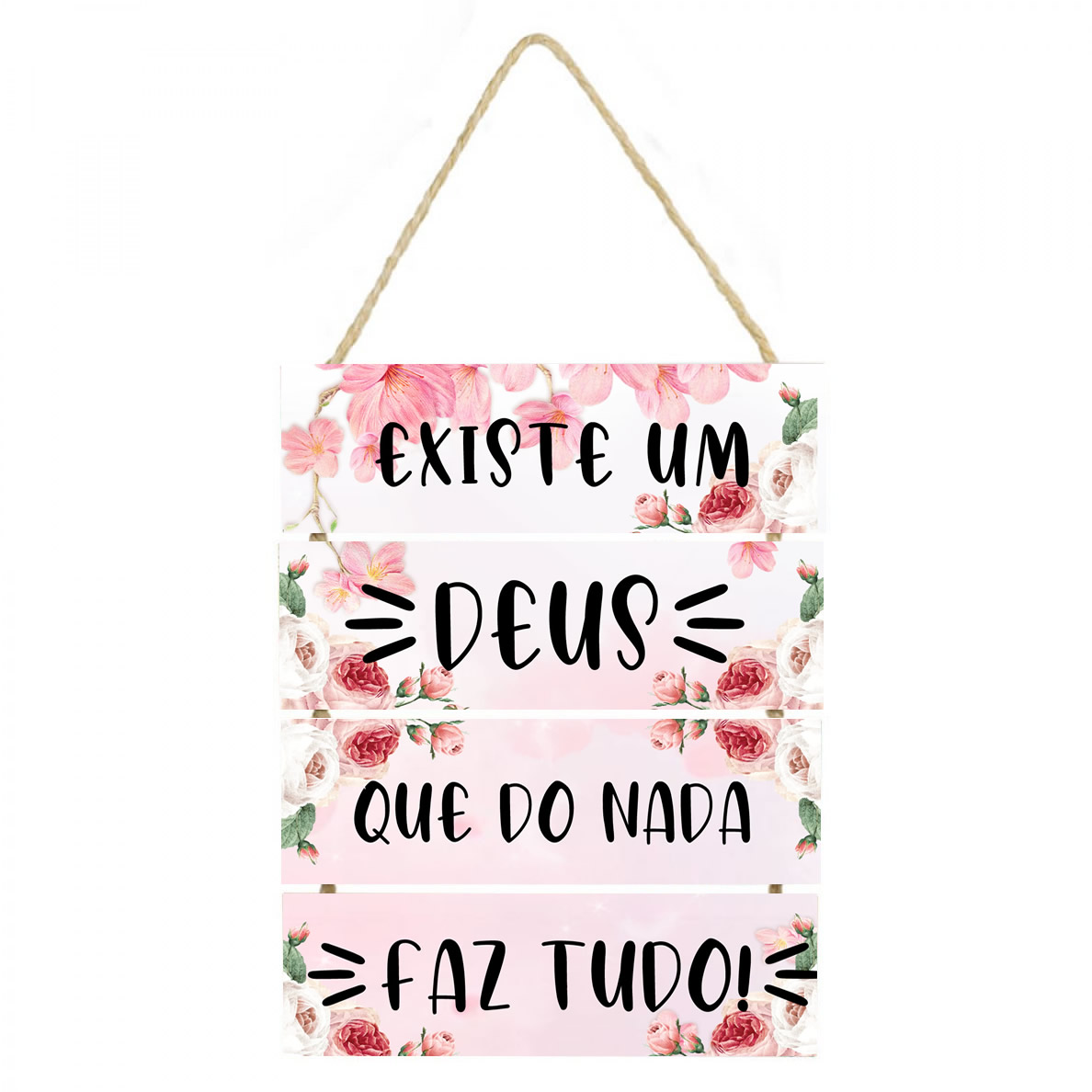 PL053 | Placa decorativa Existe um Deus que do nada faz tudo 053 | Livros e Revistas | Placa decorativa feito em mdf com corda de sisal Imagem impressa papel Couchê de alta qualidade, placas em MDF 6 mm, corda sisal resistente. Medida total do Quadro: São 4 plaquinhas em mdf presa... | R$25,90 |