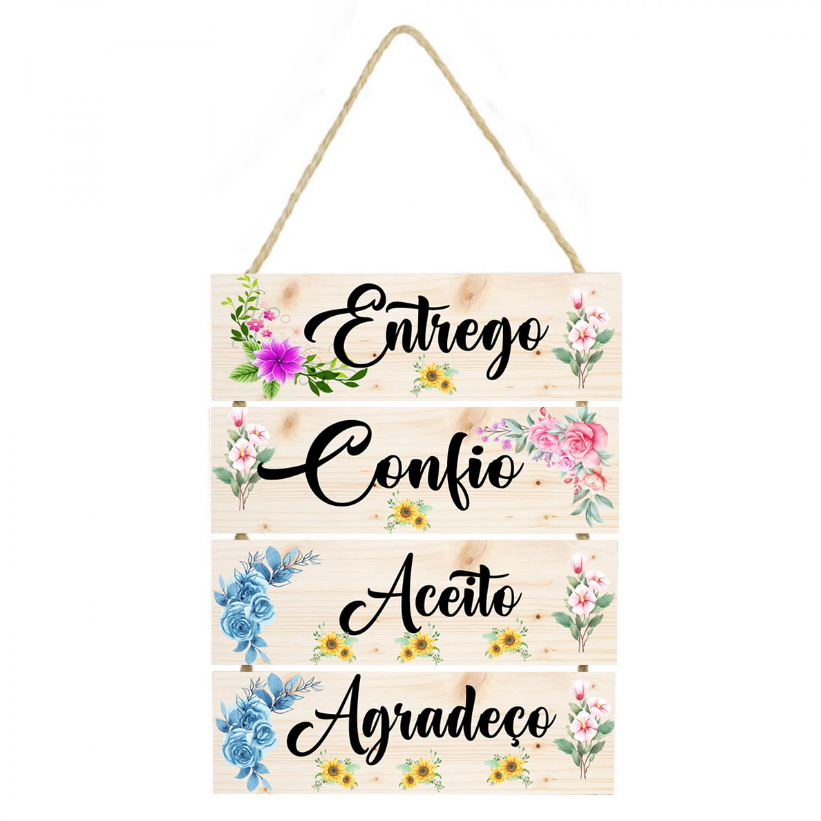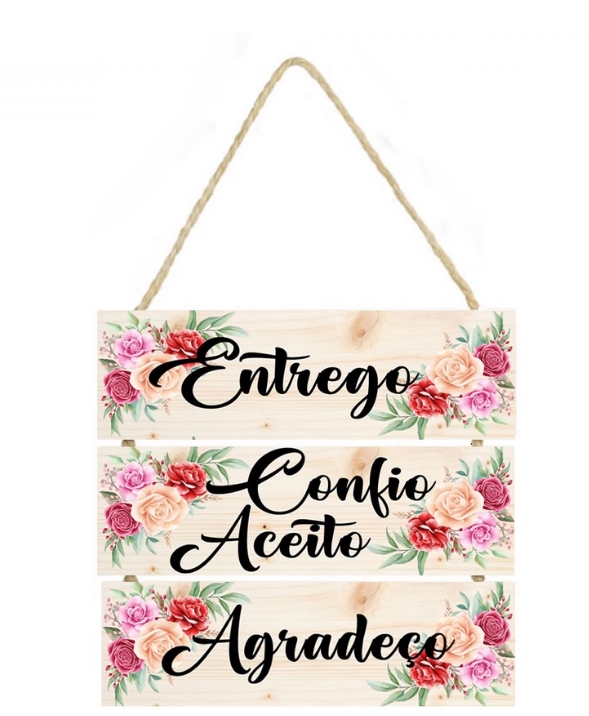 PL008 | Placa decorativa 008 com corda, Entrego confio e Agradeço | Livros e Revistas | Placa decorativa feito em mdf com corda de sisal Imagem impressa papel Couchê de alta qualidade, placas em MDF 6 mm, corda sisal resistente. Medida total do Quadro: São 3 plaquinhas em mdf presa... | R$20,90 |