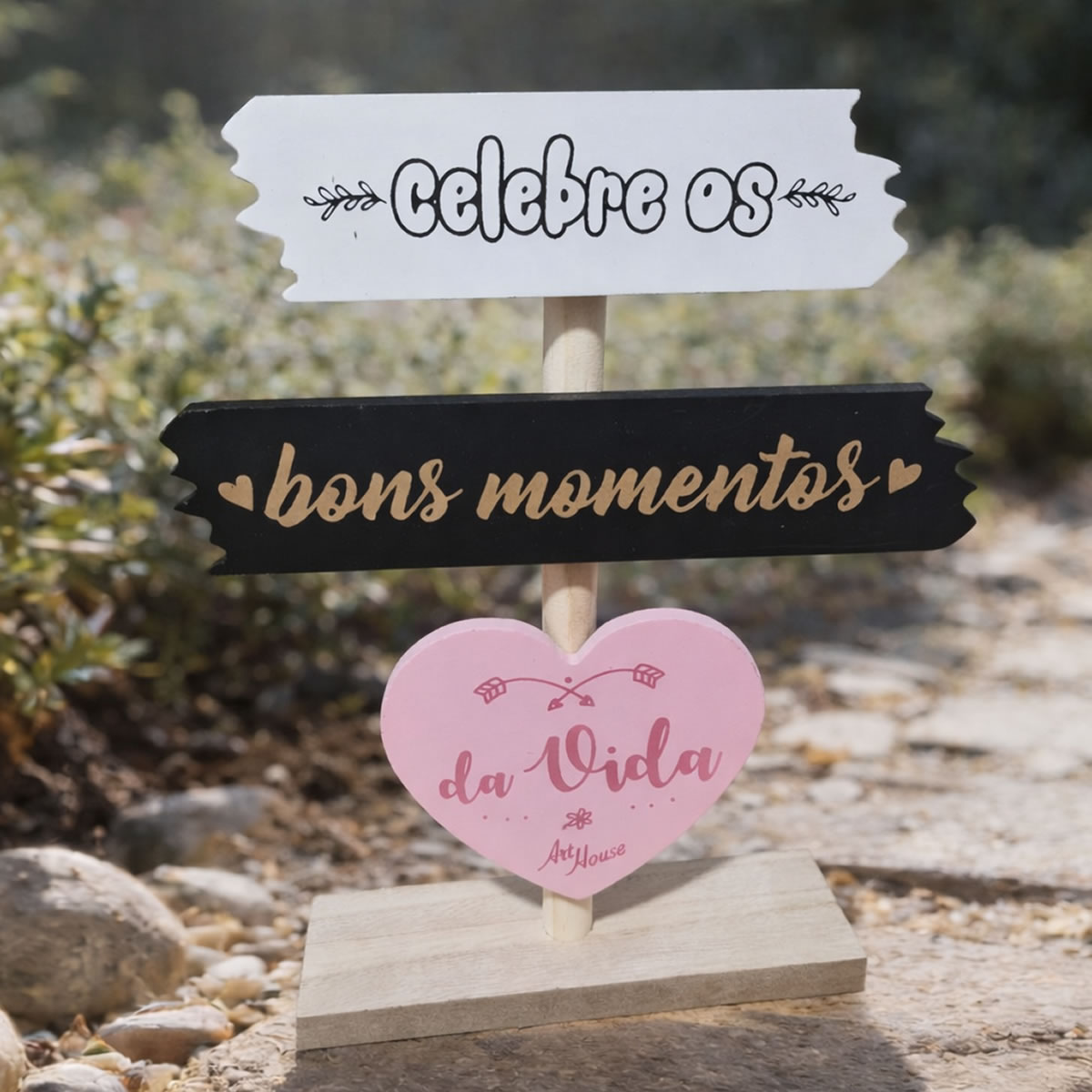 PL500 | Placa decorativa de mesa com a frase Celebre os bons momentos da vida | Personalizados | Placa decorativa de mesa com a frase ?Celebre os bons momentos da vida?, desenvolvida em MDF de 6 mm, material conhecido pela rigidez, estabilidade e excelente acabamento. A espessura garante maior re... | R$27,00 |