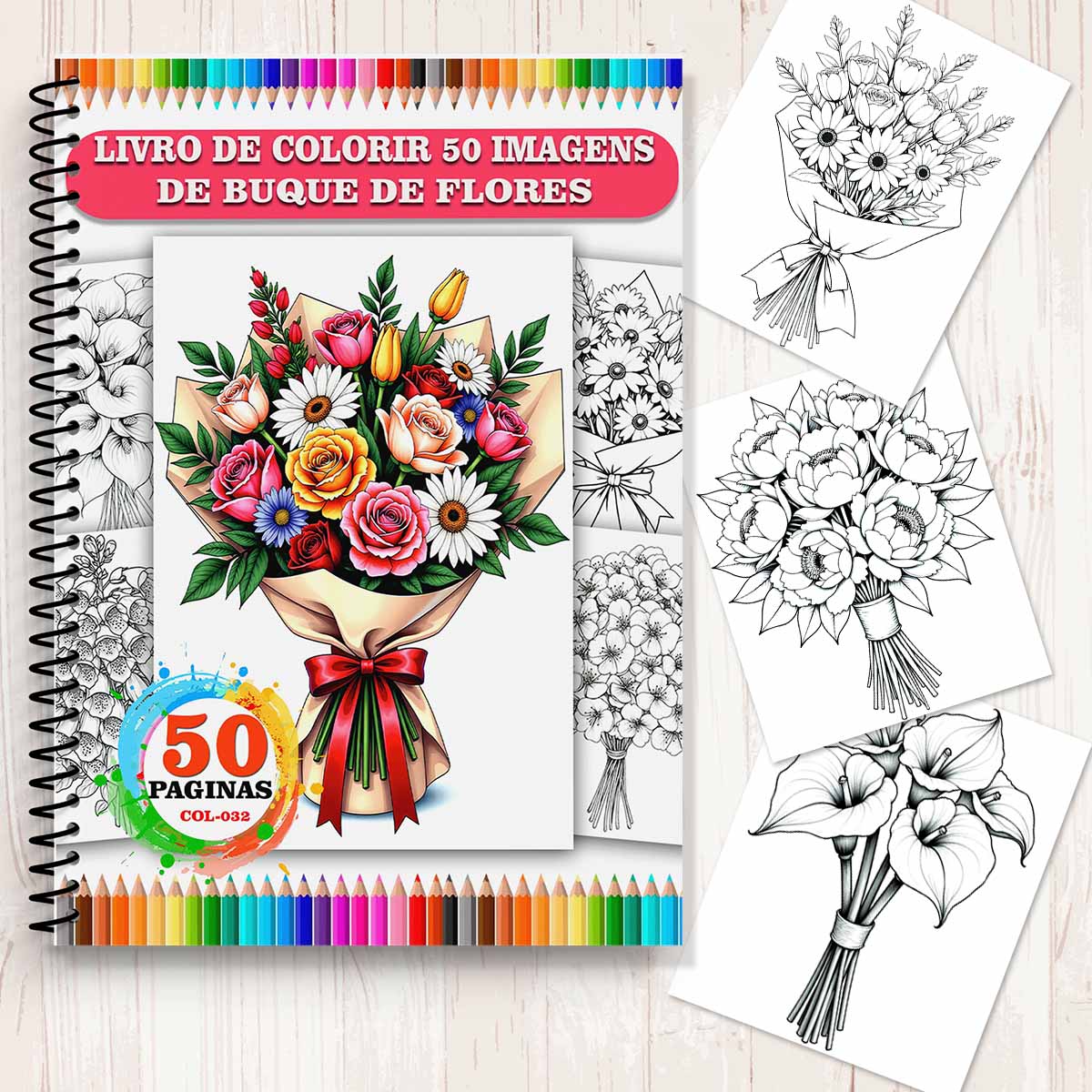 COL032 | Livro para Colorir Kit 50 Imagens Buquê de Flores | Alivia o estresse, buque florais | Livro para colorir | Livro para Colorir Kit 50 Imagens Buquê de Flores | Momentos de Paz e Criatividade Transforme seu dia com nosso encantador livro de colorir! Com 50 lindas imagens de buquês florais, cad... | R$27,00 |