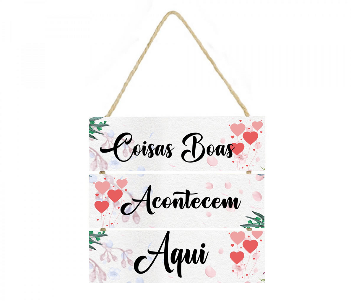 PL005 | Placa decorativa 005 Coisas boas acontecem aqui cod ,quadro | Livros e Revistas | Placa decorativa feito em mdf com corda de sisal Imagem impressa papel Couchê de alta qualidade, placas em MDF 6 mm, corda sisal resistente. Medida total do Quadro: São 3 plaquinhas em mdf Largu... | R$20,90 |