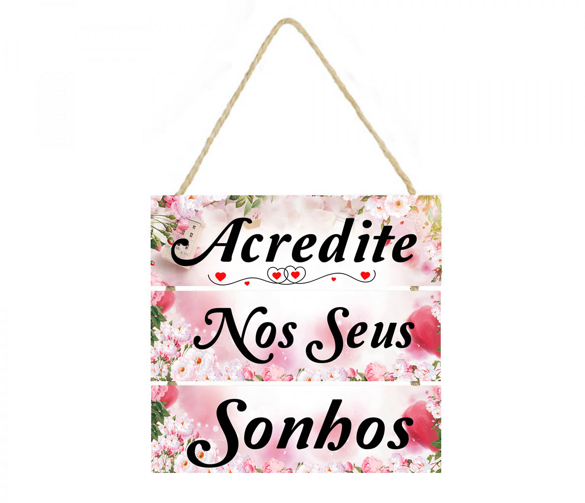 PL038 | Placa decorativa frase Acredite nos seus sonhos cod 038 | Livros e Revistas | Placa decorativa feito em mdf com corda de sisal Imagem impressa papel Couche de alta qualidade, placas em MDF 6 mm, corda sisal resistente. Medida total do Quadro: São 3 plaquinhas em mdf presas ... | R$25,90 |